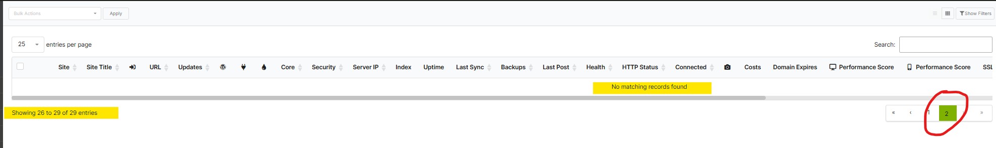 I am having problems accessing sites on the second page of my MainWP Dashboard. I can access the sites if I immediately go to the second page upon loading the dashboard. If I click the WordFence Plugin icon to check a site I am then unable to access page 2 sites. An error message shows “No Matching Records Found” while the records list shows “Showing 26 to 29 of 29 entries”.
