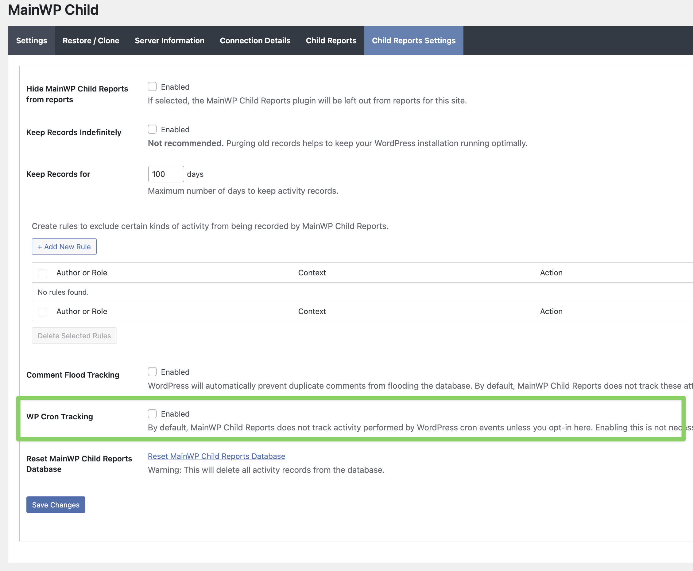 By default, MainWP Child Reports does not track WP-Cron activity, so those auto-updates will not appear in the Child Reports log or report unless WP Cron Tracking is enabled in the Child Reports settings.