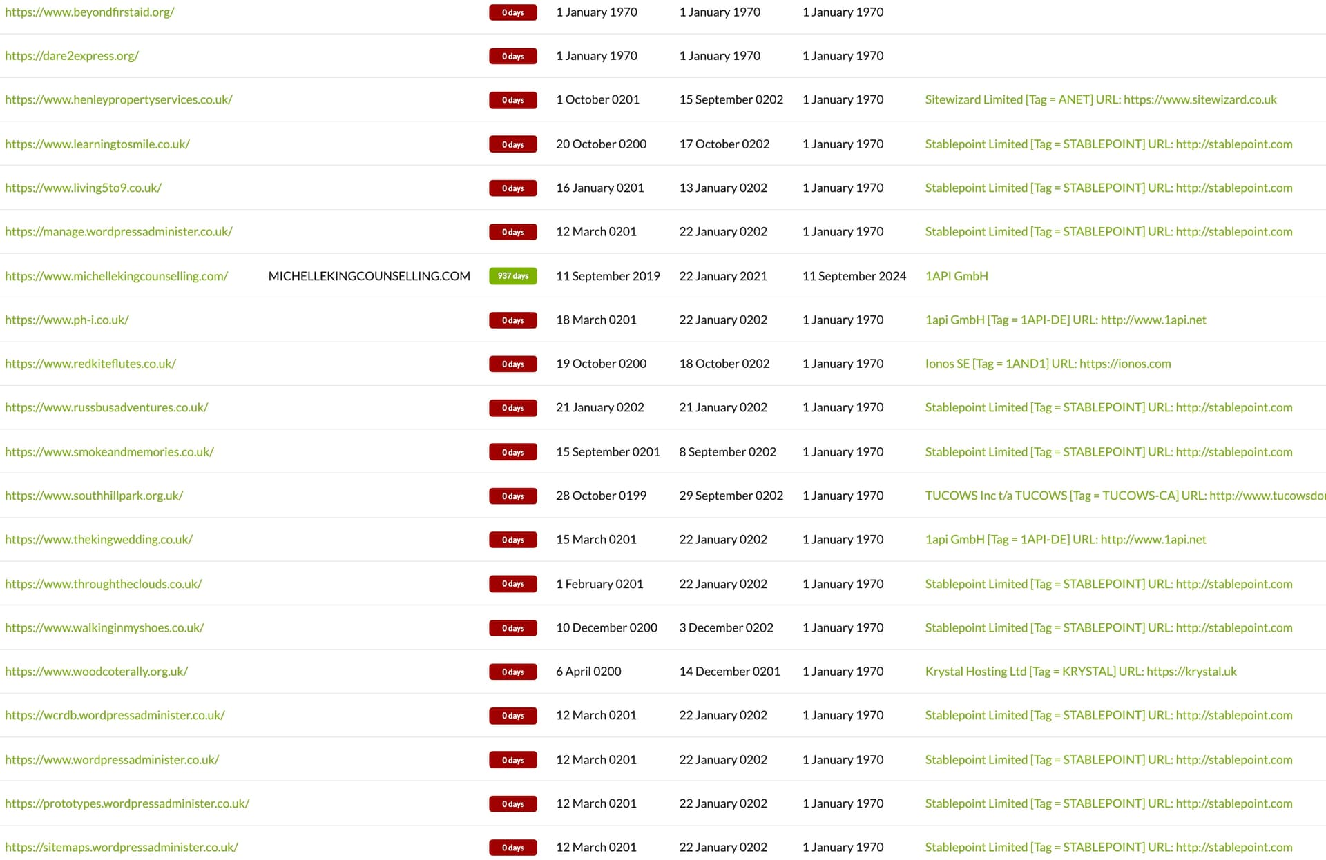 This looks very promising. Iâm only checking about 20 sites and the results came back quickly - except for some reason I have a site that simply wonât check. I see no error messages. The creation date/updated date/expiry date all say Dec 31, 1969. The domain is hosted with GoDaddy. The only thing different about this and other domains is the TLD is .cloud rather than a more common .com/.org.