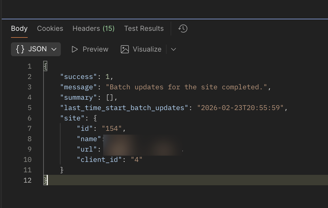 The issue appears to occur only with the API response. When I call either the sync or get updates API endpoints after triggering an update via the API, the response still returns the same update data as before the update was performed. In other words, the API response does not reflect the latest update state, even though the child site and dashboard UI show the correct status.