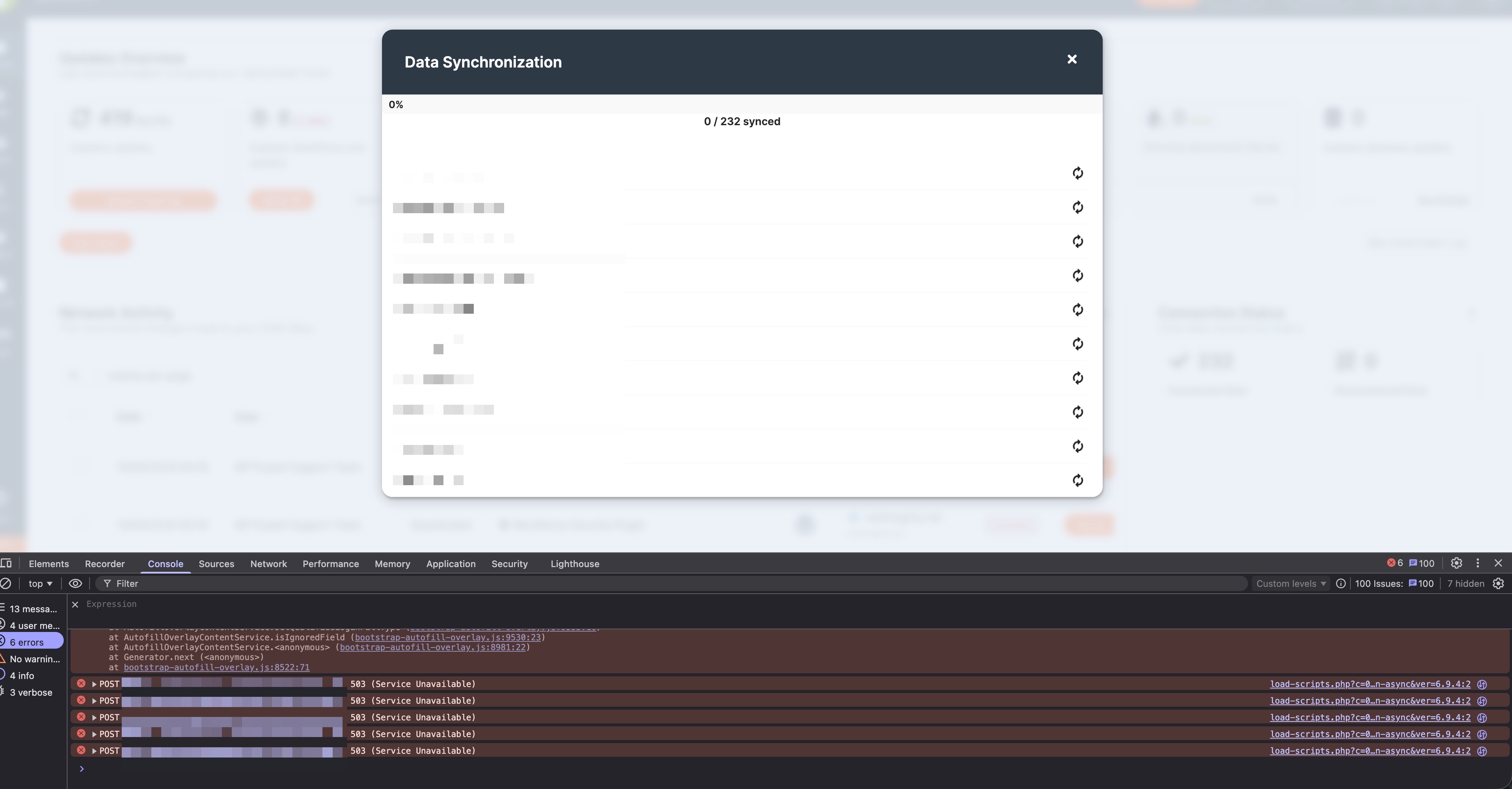 We tried everything we could think of before contacting the support and yes, we do have error in the console but only Error 503 which means that we don’t have any resources available! And it is only happening on manual sync or updates. The auto daily updates works fine as we can see new updates available in the dashboard… We have the same install, similar numbers of sites as we had with 5.4.