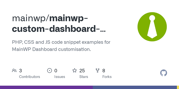 PHP, CSS and JS code snippet examples for MainWP Dashboard customisation - examples including how to move the button to the top of the menu stack (under PHP):